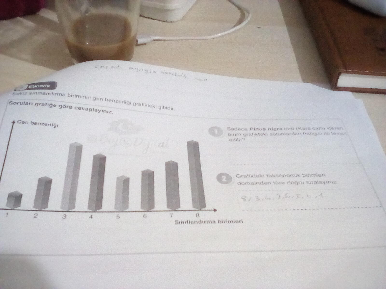 Açıklama: Taksonomide daha geniş birimler (domain, kingdom vb.) içerdikleri farklı türler nedeniyle birbirine daha az gen benzerliği gösterir; en özel birim (tür) ise kendi içinde en yüksek gen benzerliğini verir. Senin kağıtta yazdığın 8,3,4,7,2,6,5,1 sırası ise türden domaine (büyükten küçüğe) doğru olan ters sıradır.