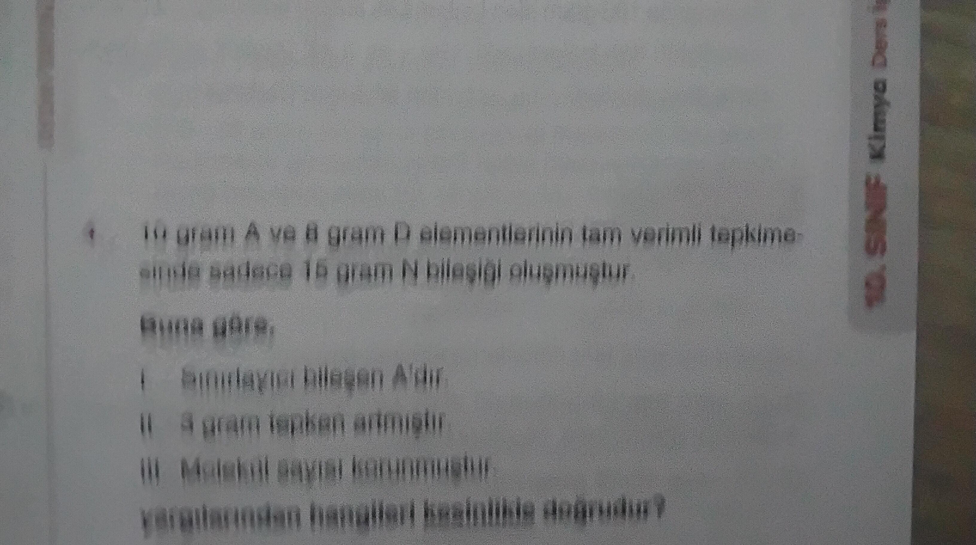 10 gram A ve 8 gram B elementlerinin tam verimli tepkimesinde sadece 10 gram N bileşiği oluşmuştur. Buna göre: