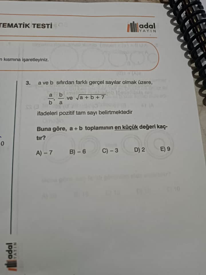Seçeneklerde a + b, -7, -6, -3, 2, 9 gibi değerler alabileceği belirtilmekte.