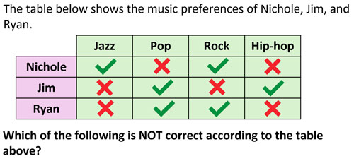 The table below shows the music preferences of Nichole, Jim, and Ryan. Which of the following is NOT correct according to the table above?