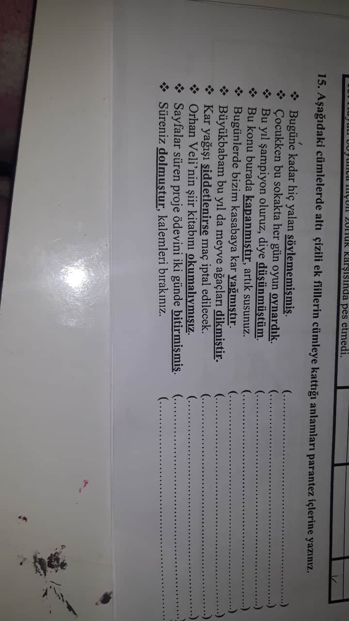 15. Aşağıdaki cümlelerde altı çizili ek fiillerin cümleye kattığı anlamları yazalım.