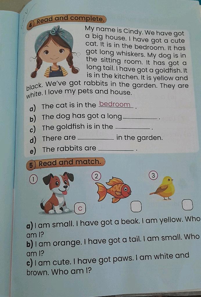 - The text says “My dog is in the sitting room. It has got a long tail.” so 4b = long tail.