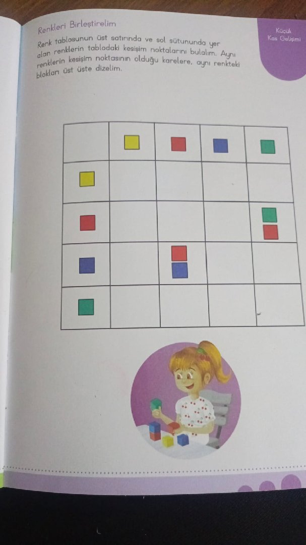 Renkleri Birleştirelim ablosunun Gst satirinda ve sol sütununda uer alan renklerin tablodaki kesişirn noktaların bulalım. Auni renklerin kesişim noktasinin olduğu karelere, aunt renkteki bloklar üst üste dizelim Kücuk Kas Gelgmi