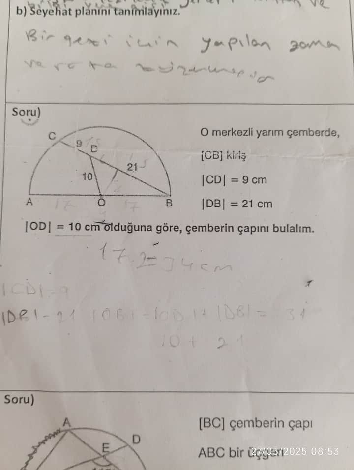 O merkezli yarım çemberde [CB] kirişi üzerinde |CD| = 9 cm, |DB| = 21 cm ve |OD| = 10 cm veriliyor. Buna göre, çemberin çapını bulunuz.
