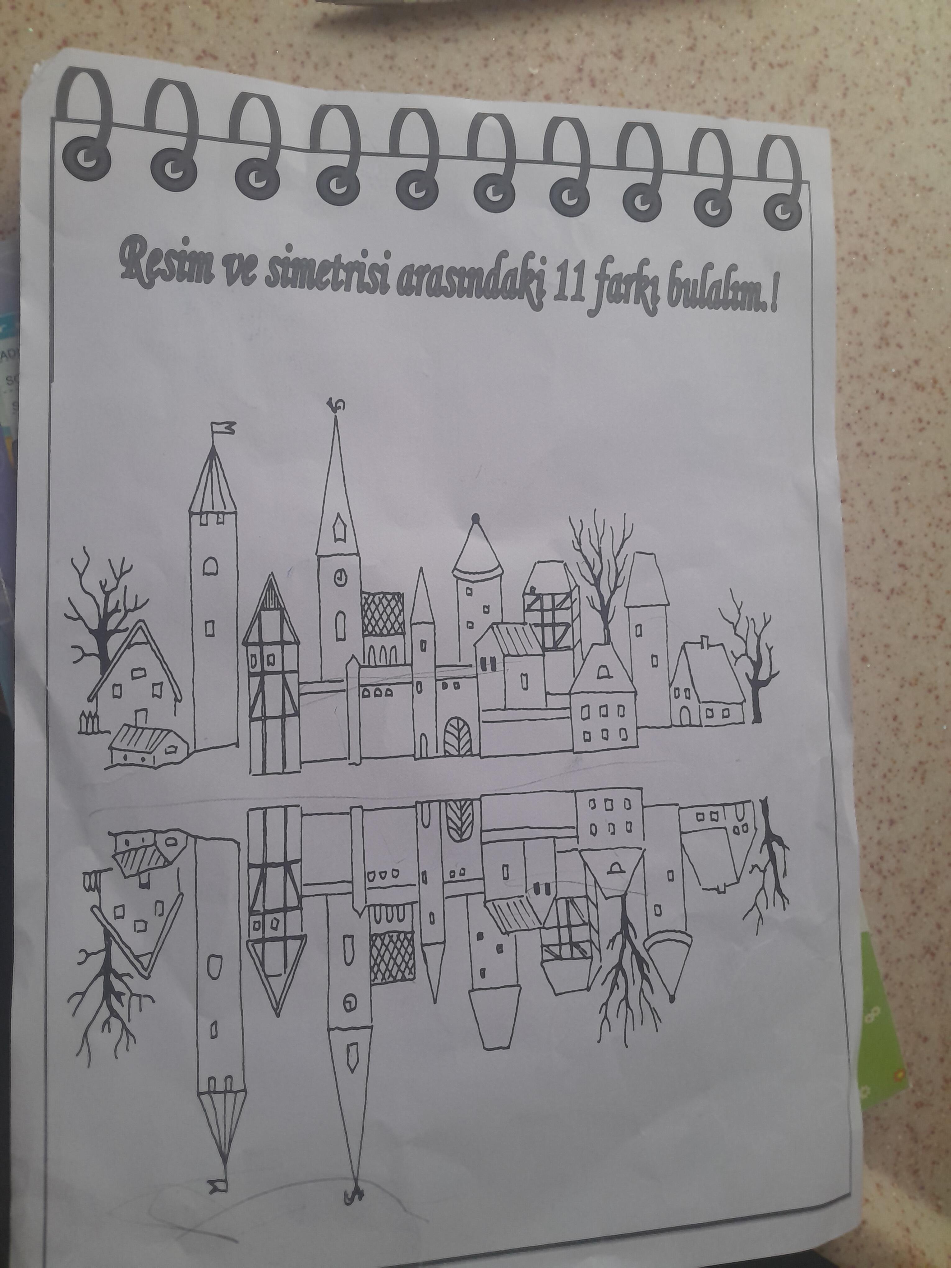 Bu alıştırma, “Resim ve simetrisi arasındaki 11 farkı bulalım!” başlığını taşıyor. Üst kısımda bir şehir manzarası çizimi, tam altında ise onun yansıtılmış (ters çevrilmiş) görüntüsü yer almakta. Amacımız, iki görsel arasındaki 11 adet küçük farkı tespit edip işaretlemek.