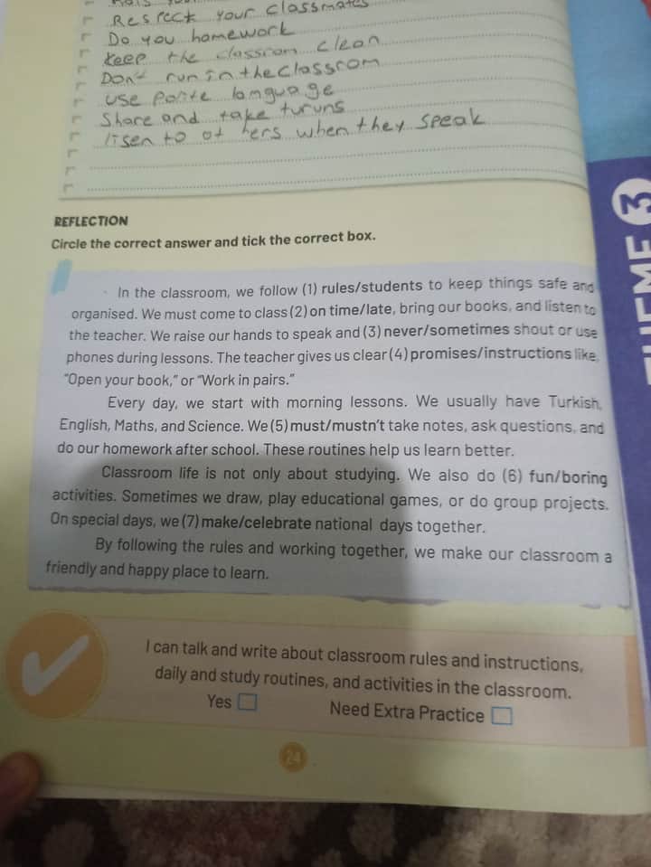 • “I can talk and write about classroom rules…” cümlesini anladıysan “Yes” kutusunu işaretle.