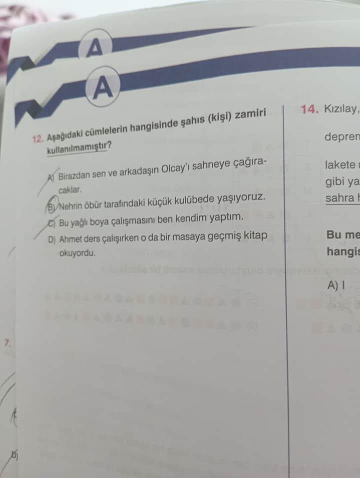 | B | Şahıs zamiri yok. Dolaylı kişiye yönelik bir ifade bulunmaktadır. | Doğru cevap. |
