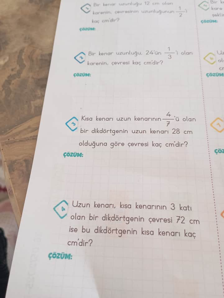 | 4 | Uzun kenarı, kısa kenarının 3 katı olan dikdörtgenin çevresi 72 cm → kısa kenarı kaç cm? | 8x=72 → x=9 cm (kısa kenar), uzun kenar=27 cm | Kısa kenar=9 cm, U=27 cm* |