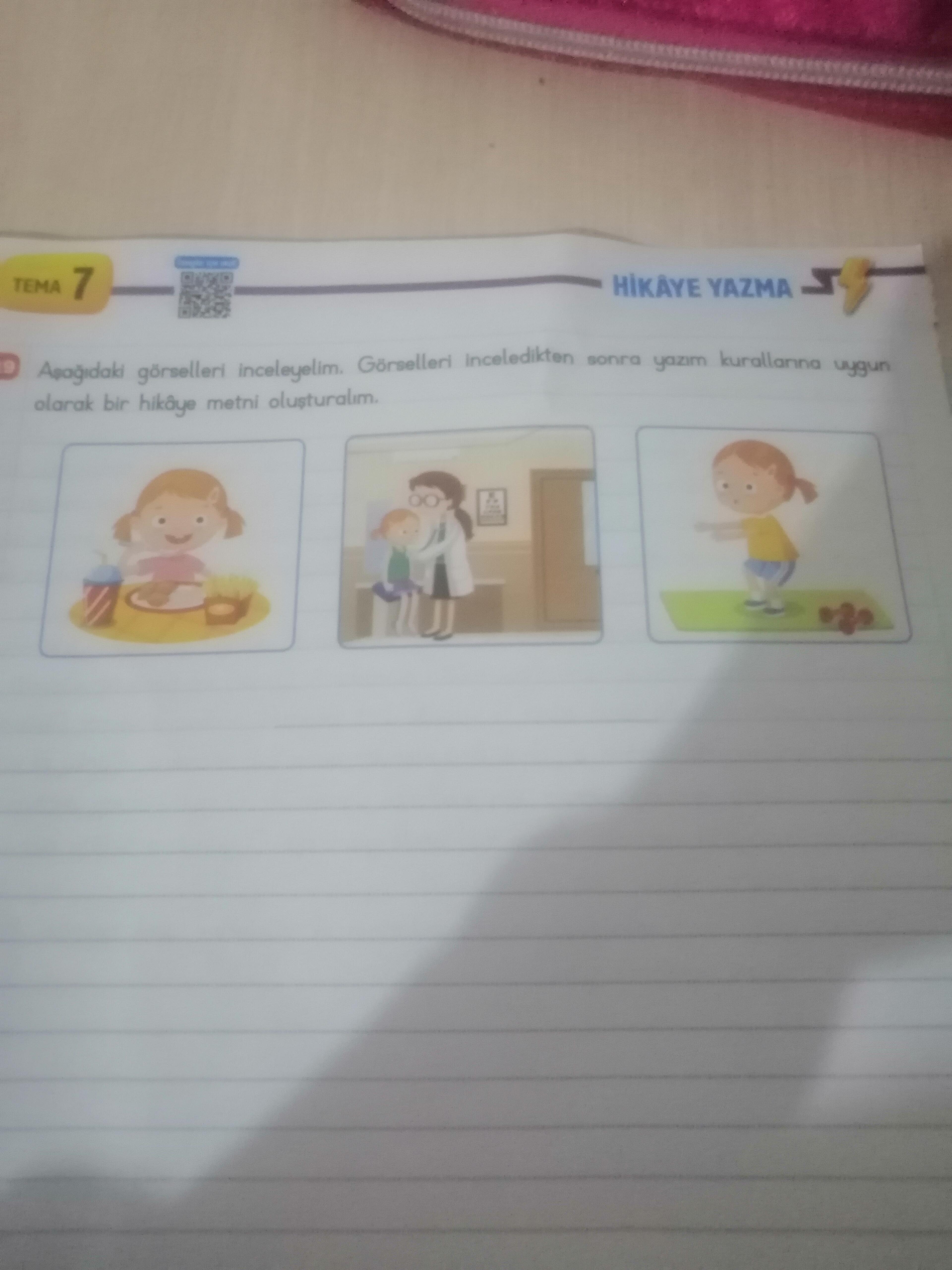 Soru: Resimde verilen durumlardan yola çıkarak bir hikaye yazılması isteniyor. Görselde üç farklı sahne yer alıyor: bir çocuk yemek yapıyor, bir çocuk büyüğüne saygı gösteriyor ve bir çocuk oyun oynuyor.