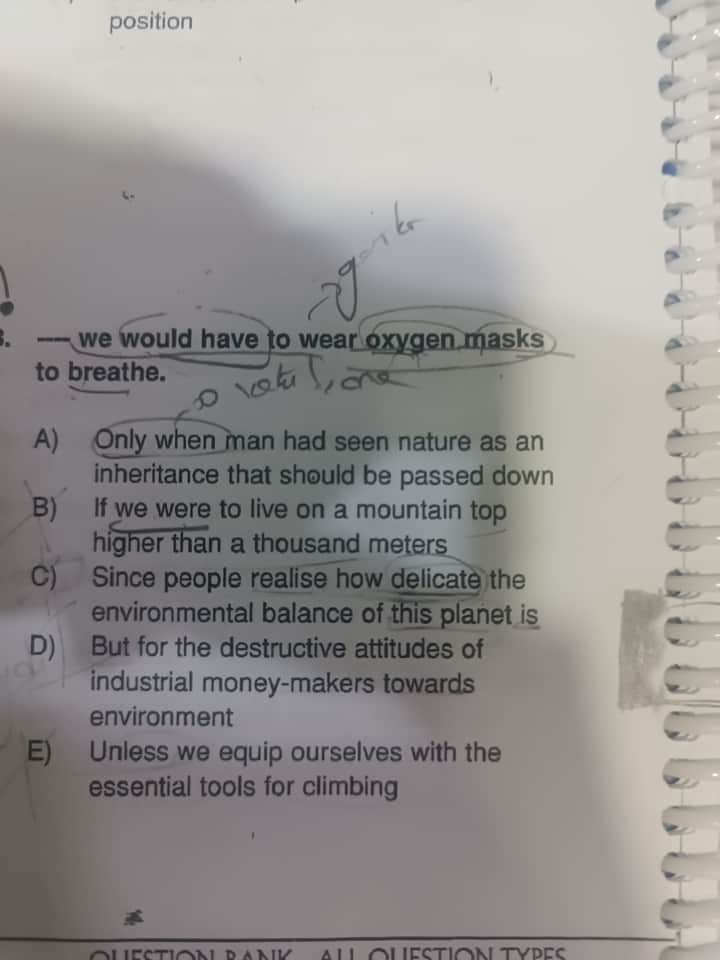 Özetle, “Eğer bin metreden daha yüksek bir dağ zirvesinde yaşasaydık, nefes alabilmek için oksijen maskesi takmak zorunda kalırdık.” anlamını veren B şıkkı doğru cevaptır.