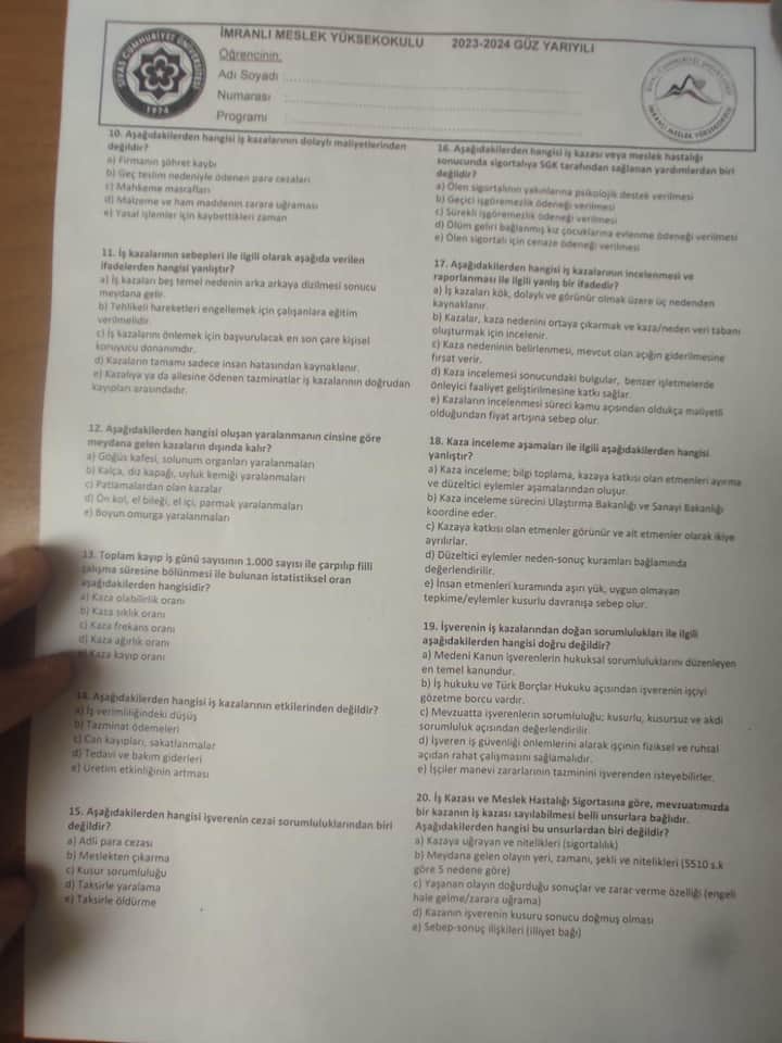| 11 | İş kazalarının nedenleri | d) Sadece insan hatası yanlış | Kazalar farklı nedenlerle oluşur |