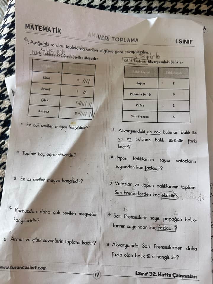 - Balık Tablosu: En çok Japon balığı (8), en az Vatoz (2). Fark sorularında büyük-küçük karşılaştırmalarla sonuçlar 4, 6 ve 2 olarak bulundu.