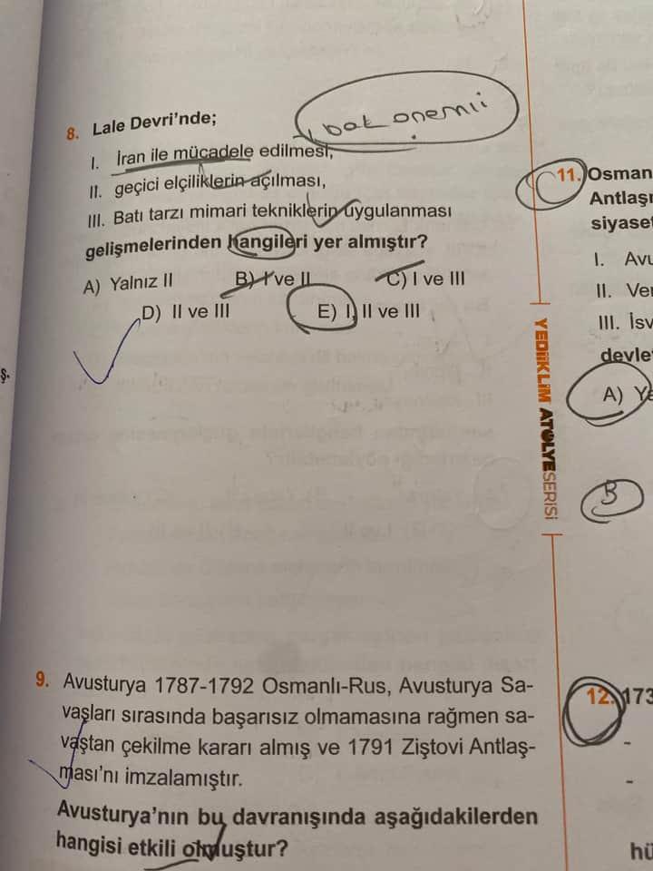 8. Lale Devri’nde; I. İran ile mücadele edilmesi, II. geçici elçiliklerin açılması, III. Batı tarzı mimari tekniklerin uygulanması gelişmelerinden hangileri yer almıştır?