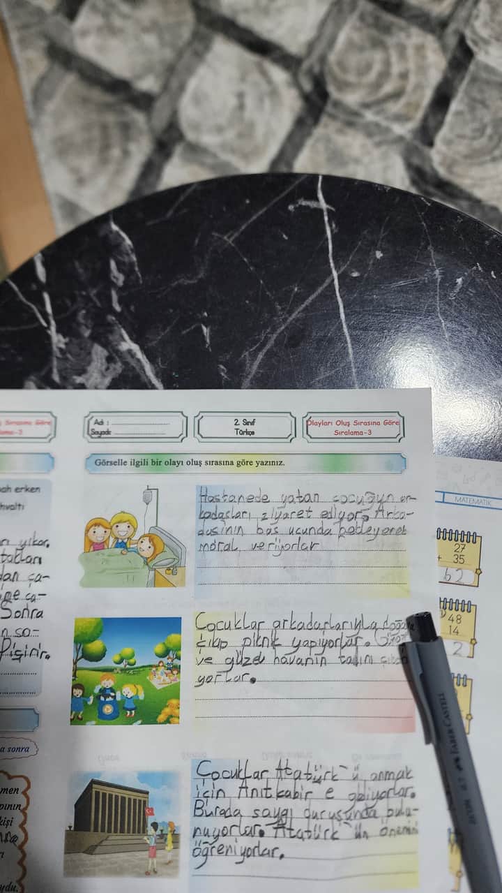 Görsellerdeki sıraya göre olayların mantıksal akışını inceleyerek başlayın. Önce hasta ziyareti, sonra doğa gezisi ve en son Anıtkabir ziyareti mantıklı olur.