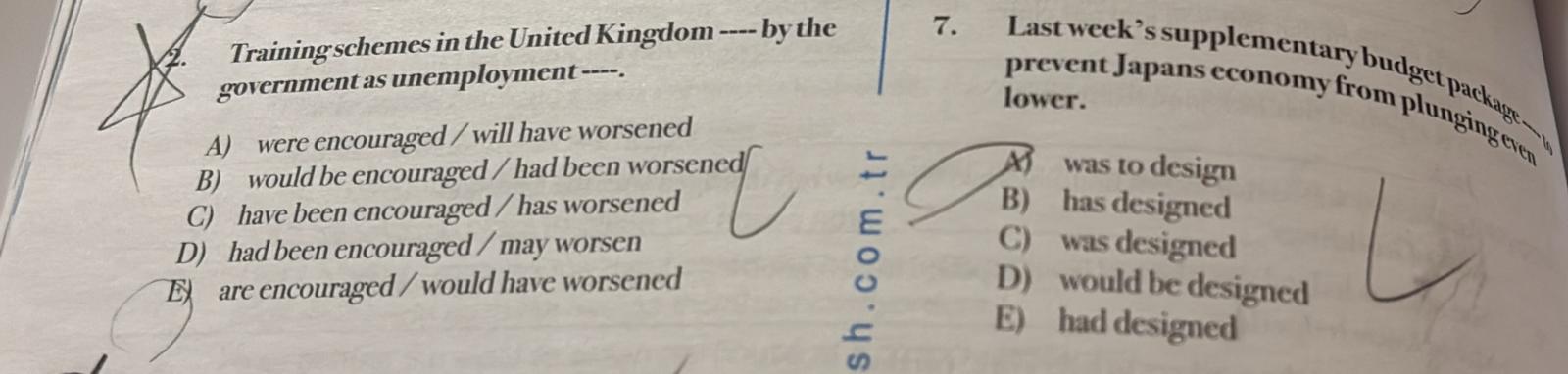 Doğru cevap C şıkkıdır. “have been encouraged” present perfect passive ile, “has worsened” ise present perfect ile kullanılarak cümleye “Hükümet, işsizlik kötüleştiği için Birleşik Krallık’taki eğitim programlarını teşvik etmiştir.” anlamını katar.