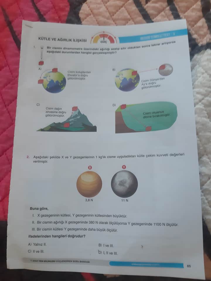 - İkinci soru: X ve Y gezegenlerinin ağırlık değerleri incelendiğinde kütlenin sabit olduğu, ancak kütle çekim kuvvetinin (dolayısıyla ağırlığın) gezegene göre değiştiği görülür. Burada yalnız II numaralı ifade geçerlidir.