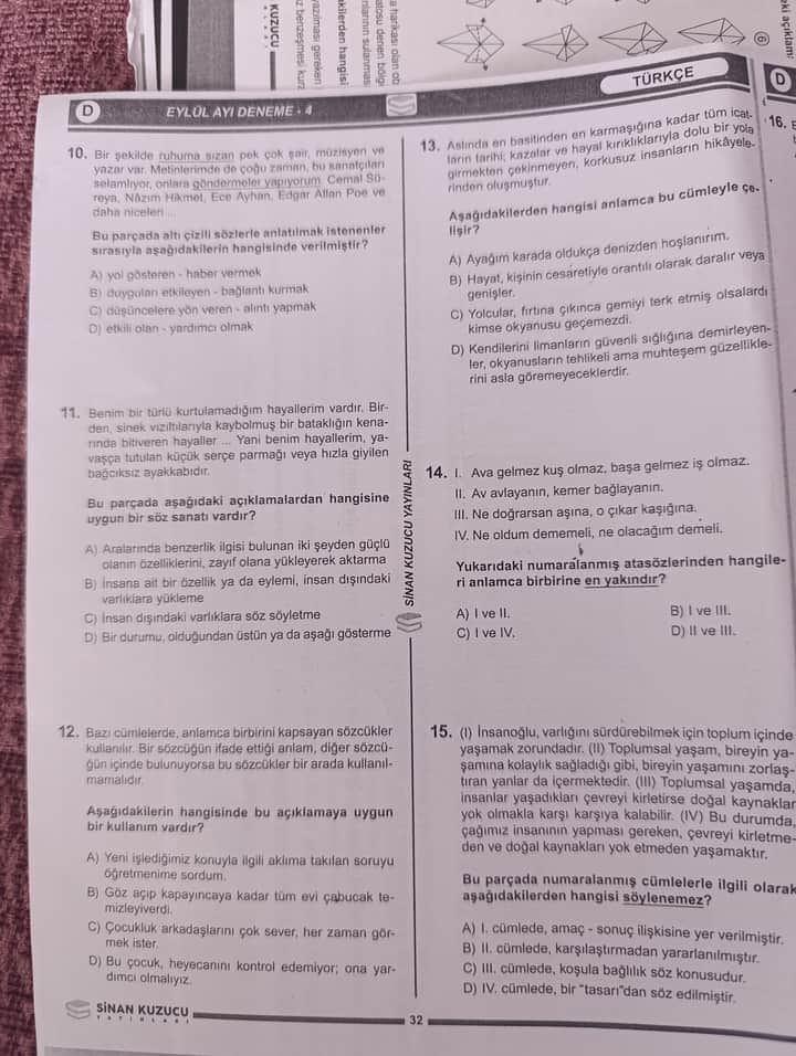 | 14 | C | Anlam bakımından en yakın atasözleri |