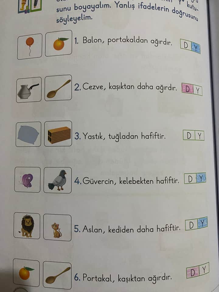 | 6 | Portakal, kaşıktan ağırdır. | Y |