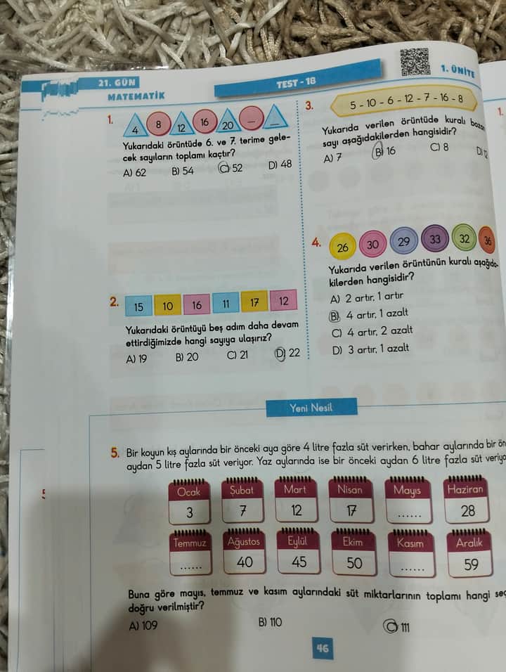 Soru: “4, 8, 12, 16, 20, …” örüntüsünde 6. ve 7. terim