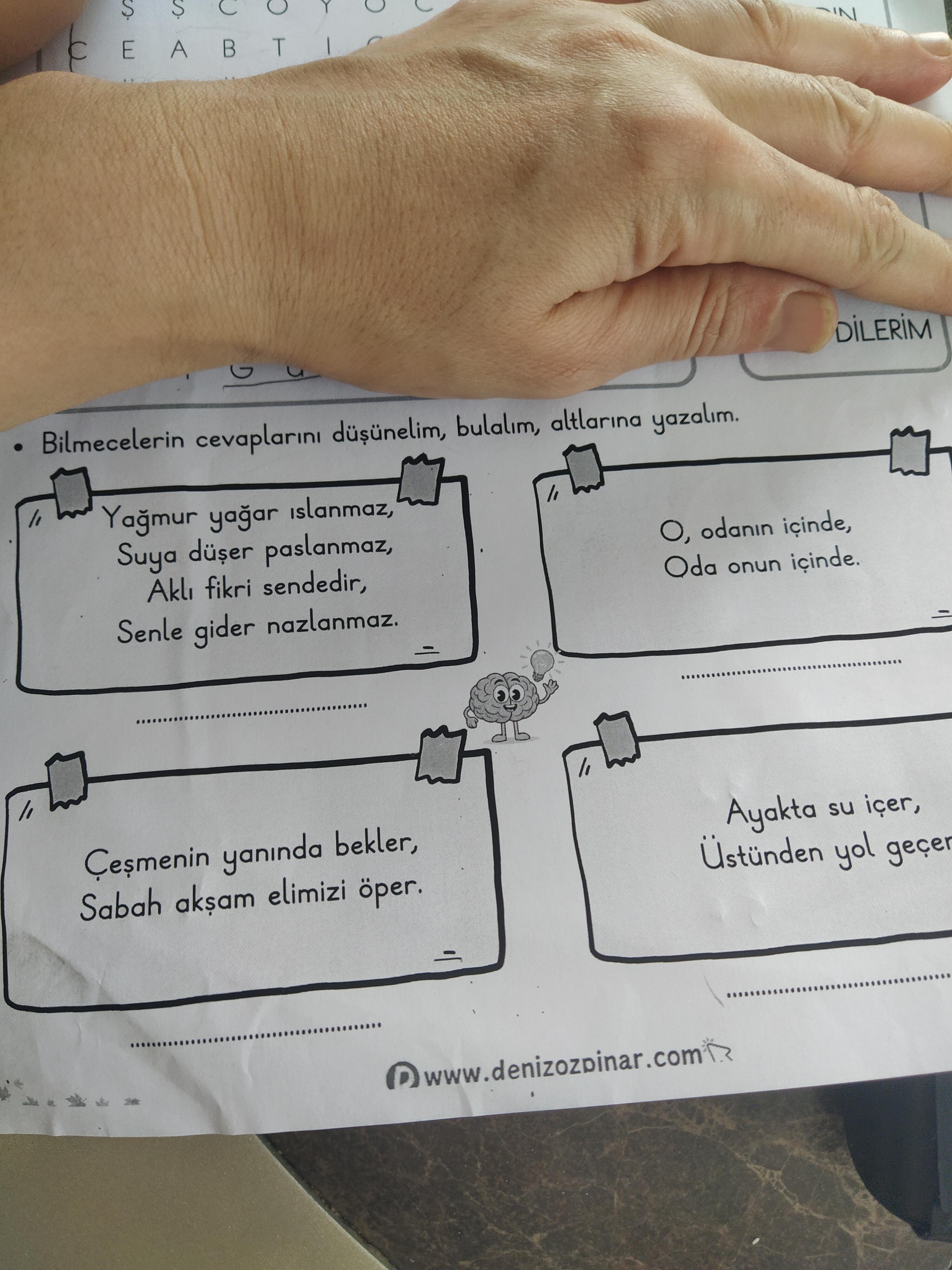 Resimde verilen bilmecelerin cevaplarını bulmamız isteniyor. Bilmeceler ve boşluklar aşağıdaki gibidir: