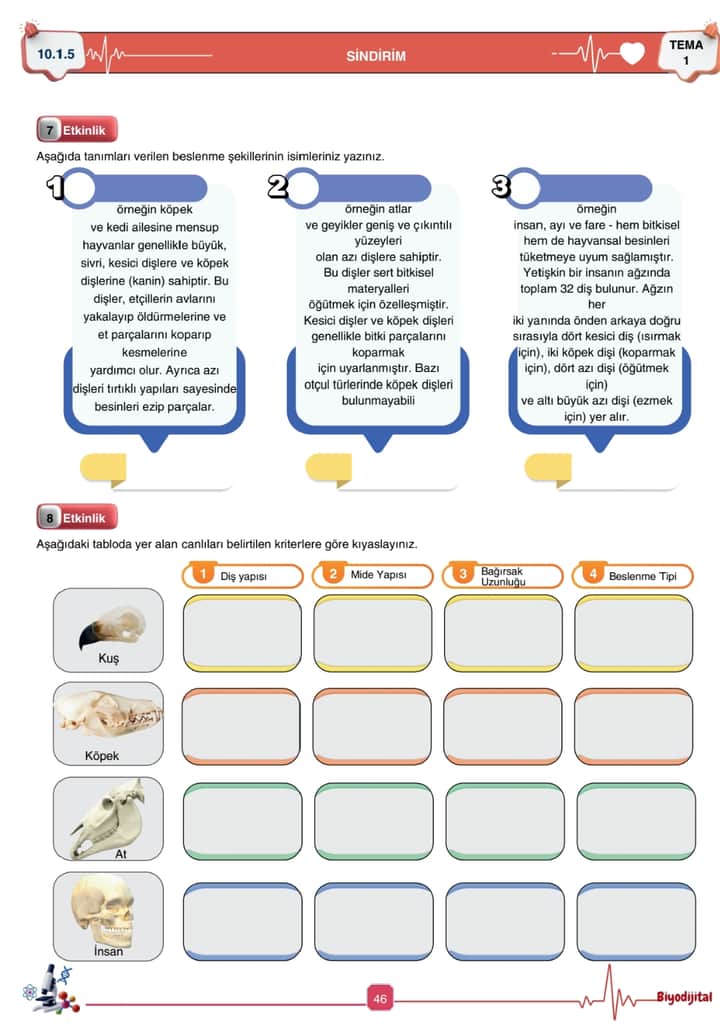 Özet: Resimdeki üç tanım sırasıyla Etçil — Otçul — Hepçil (Omnivor) olarak adlandırılır. 8. etkinlik tablosu yukarıdadır; her bir canlı için diş ve sindirim sistemi özellikleri beslenme tipini açıkça gösterir.