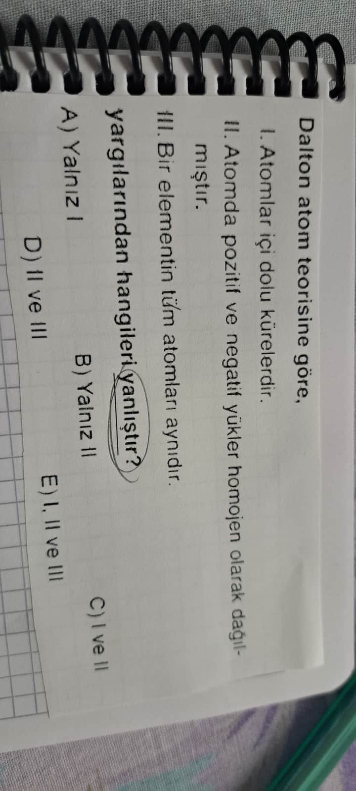 Dolayısıyla yalnız II. yargı Dalton atom teorisine göre yanlıştır.