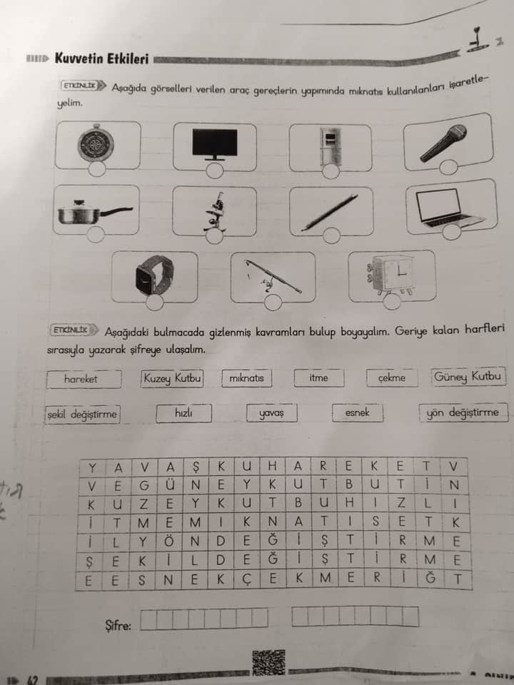 Aşağıda verilen araç gereçlerin yapımında mıknatıs kullanılanları işaretleyelim. Sonrasında bulmacada gizlenmiş kavramları bulup boyayalım ve kalan harflerle şifreyi çözelim.