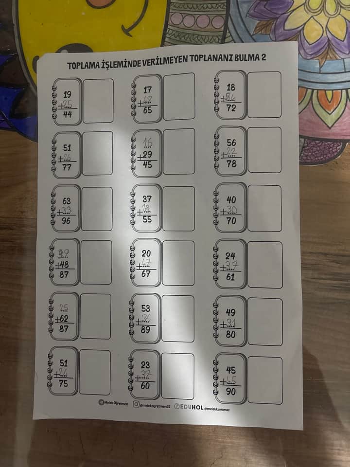 Resimdeki her bir toplama işleminde, toplam verilmiş ve bir toplanan eksik bırakılmıştır. Eksik toplanan, toplamdan verilen diğer toplananın çıkarılmasıyla bulunur.