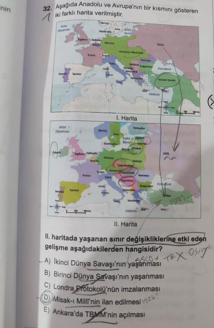 Dolayısıyla “Bu soru için ‘Misak-ı Millî’nin ilan edilmesi’ ifadesi (D seçeneği) doğru değildir; esasen II. haritada gözlenen kapsamlı sınır değişikliklerine Birinci Dünya Savaşı (B seçeneği) etki etmiştir.” demek daha doğru olur.