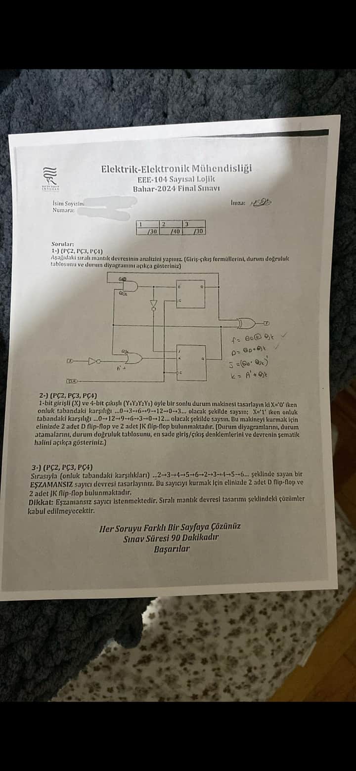 Soruda, elektrik-elektronik mühendisliği EEE-104 Sayısal Lojik dersi final sınavı çerçevesinde sıralı mantık devresi tasarımı ve analizi istenmiştir. Görsele dayalı sorunun çözümü aşağıda adım adım yapılacaktır: