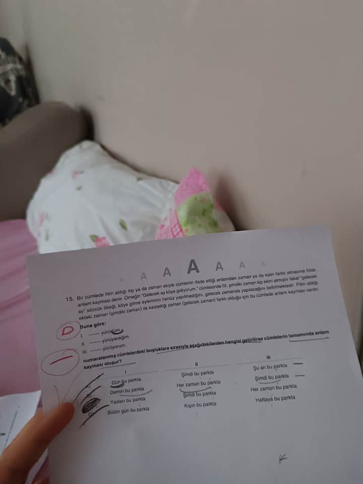 15. Bir cümlede fiilin aldığı kip ya da zaman ekiyle cümlenin ifade ettiği anlamdaki zaman ya da kipin farklı olmasına bizde anlam kayması denir. Önceki ve köye gidiyorum cümlesinde fiil, şimdiki zaman (şimdiki zaman kip eki) alarak “gelecek ay” sözcük öbeği, köye gitme eyleminin henüz yapılmadığını, gelecek zamanda yapılacağını belirtir. Filmin falı aldığı etekli zaman (şimdiki zaman) ile kastettiği zaman (gelecek zaman) farklı olduğu için bu cümlede anlam kayması verdi. Buna göre; numaralanmış cümlelerdeki boşluklara sırasıyla aşağıdakilerden hangisi getirilirse cümlelerin tamamında anlam kayması oluşur?