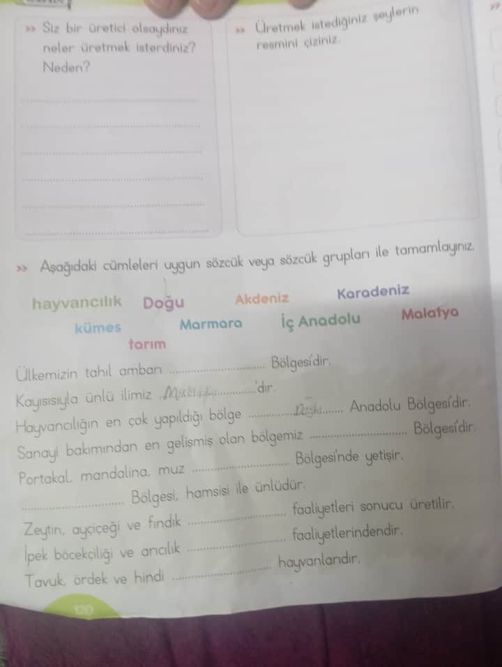 | 7. | Zeytin, ayçiçeği ve fındık …….. faaliyetleri sonucu üretilir. | tarım | Bitkisel ürünlerin tamamı tarım faaliyetleri içinde yer alır |
