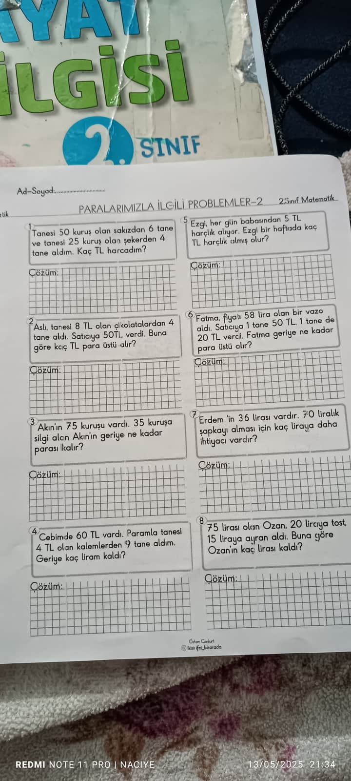 Bu 8 problem, 2. sınıf düzeyinde para kavramının hem kuruş hem de lira cinsinden hesaplanması ve dört işlem uygulamasını içerir. Çocuklar: