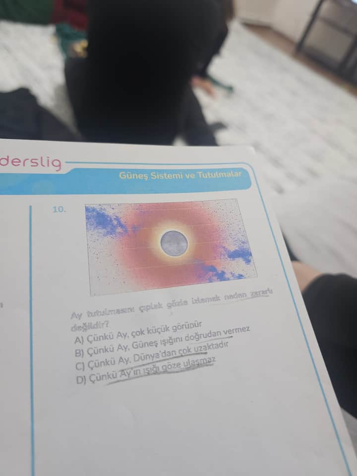 Resme baktığımızda soruda “Ay tutulmasını çıplak gözle izlemek neden zararlı değildir?” diye sorulmuş ve dört seçenek verilmiş: