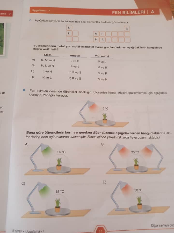 | 7. Periyodik Tablo | Harfle gösterilmiş elementlerin metal, yarı metal, ametal sınıflandırması | Şıklarda metal-sol, ametal-sağ, yarı metal-sınır kuralına göre seçim yapılır. |