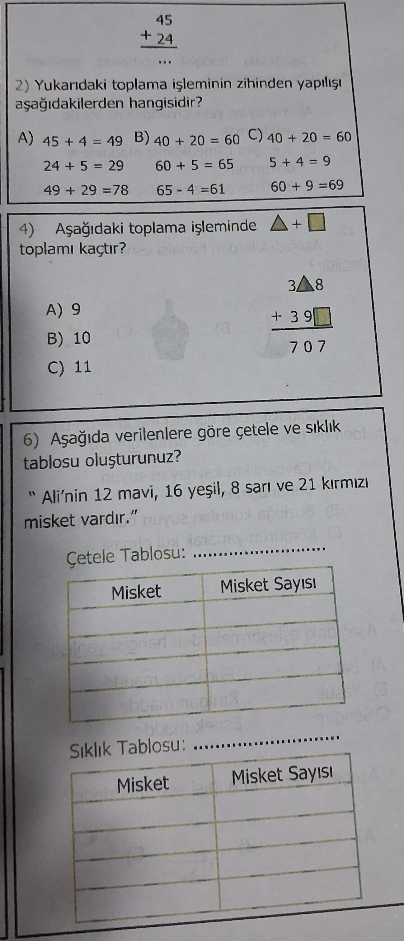 | 2 | Zihinden toplama yöntemi | C şıkkı: 40+20=60, 5+4=9, 60+9=69 |