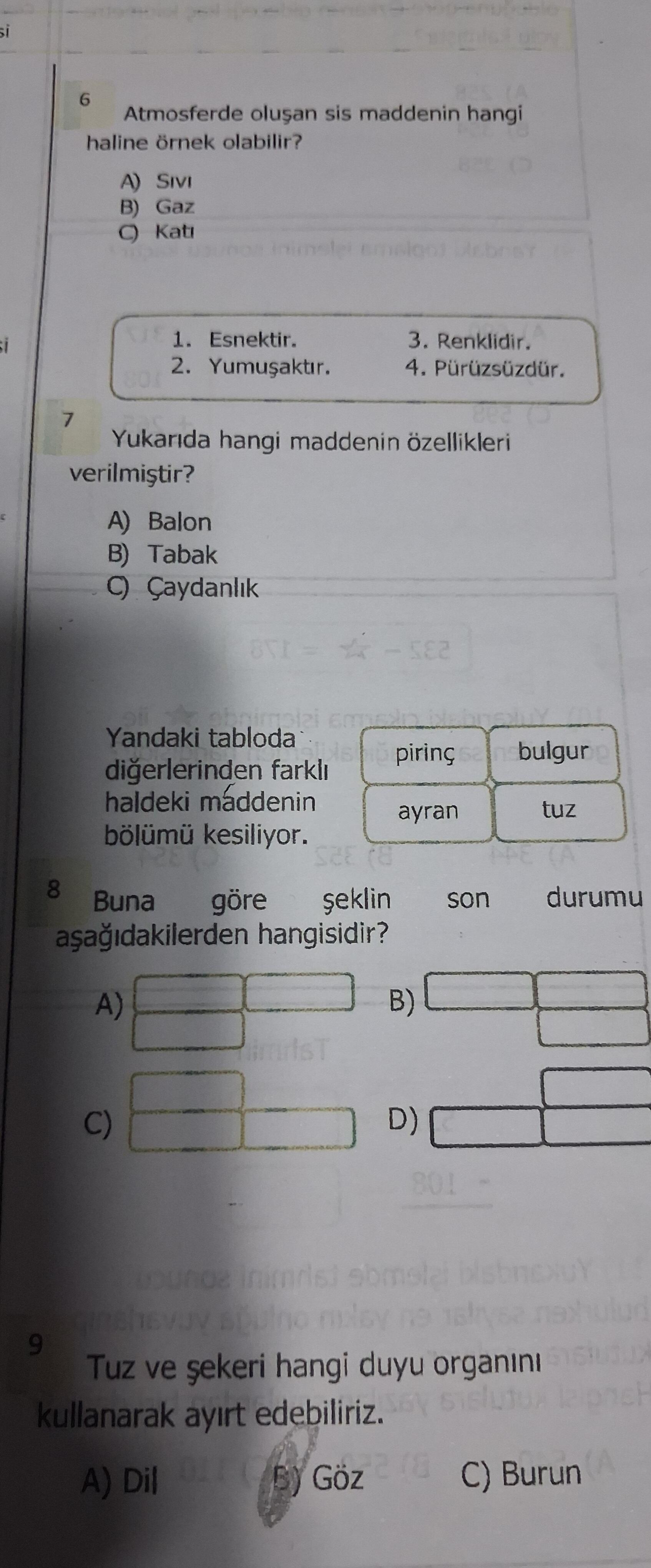 | 8 | Farklı haldeki madde çıkarılırsa şekil ne olur? | C) Şekil C | Ayran sıvı, çıkarılırsa katılar kalır. |