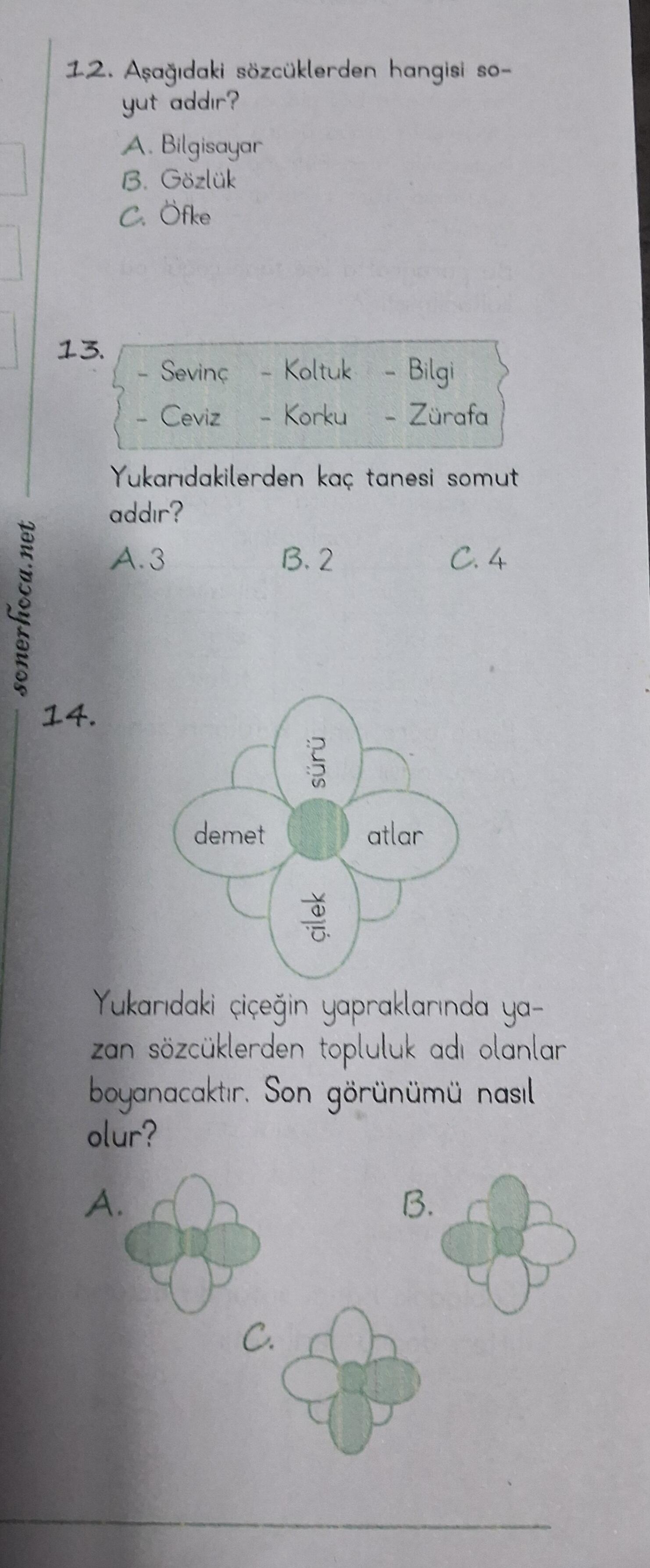 Soru 14 için önce yapraklardaki sözcükleri inceleyelim: