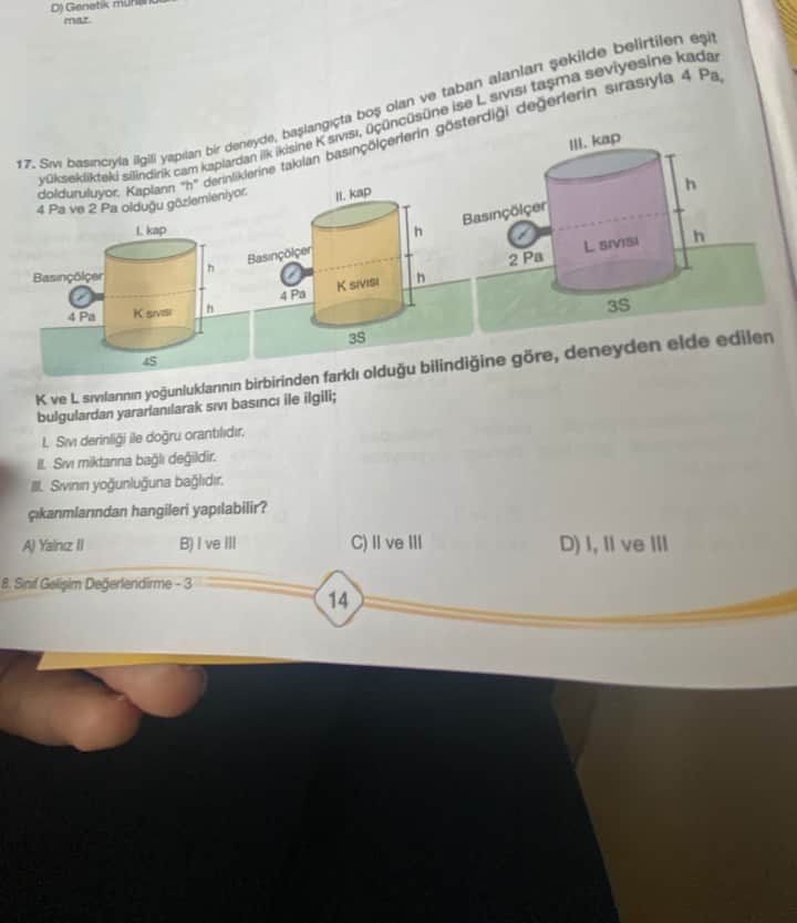 - III. kapta L sıvısının basıncı 2 Pa, aynı yükseklikteki K sıvısı 4 Pa. Bu, sıvıların farklı yoğunluklarda olduğunu gösterir. Yanıt: III yapılabilir.