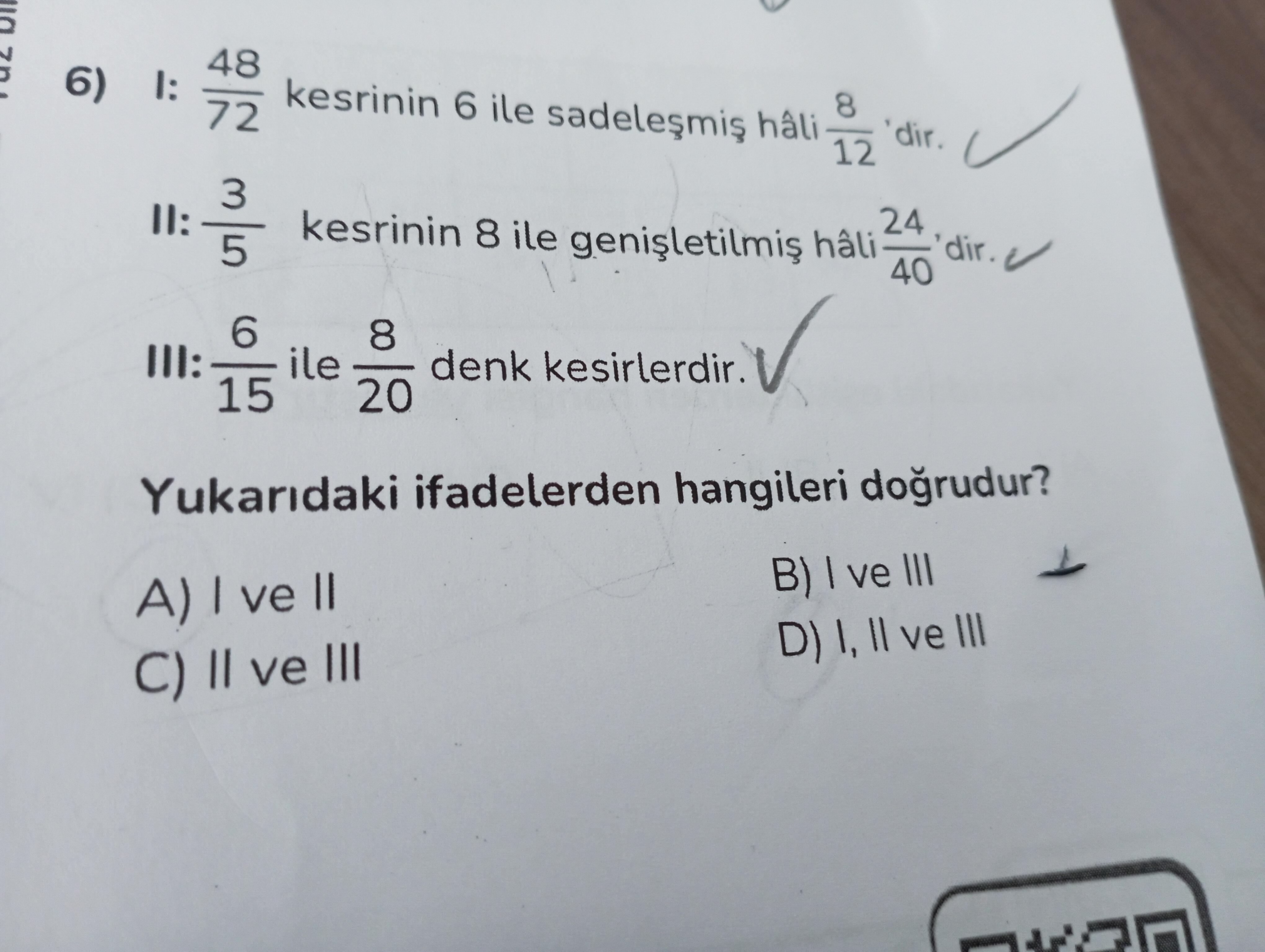 | III. 8/15 ile 20/40 denk kesirlerdir. | 8/15 ≠ 20/40 (8/15 ≈ 0.533, 20/40=0.5) | Hayır |