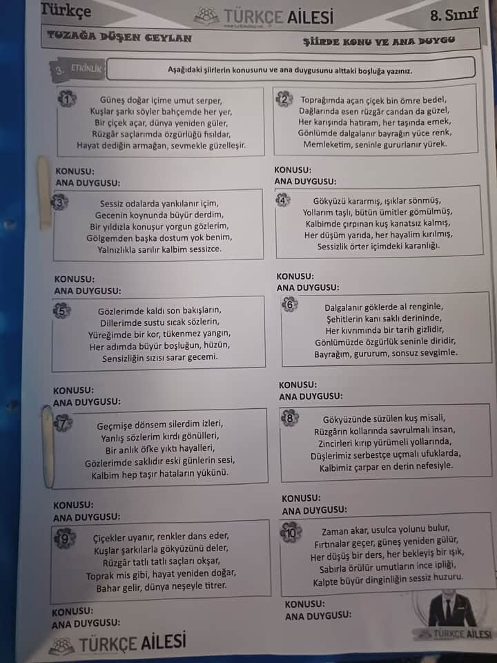 Aşağıda, her şiirin konusu ve ana duygusunu adım adım detaylı şekilde bulabilirsiniz. Şiirlerin anlamlarını, temalarını ve vermek istediği duyguları esas alacağım.