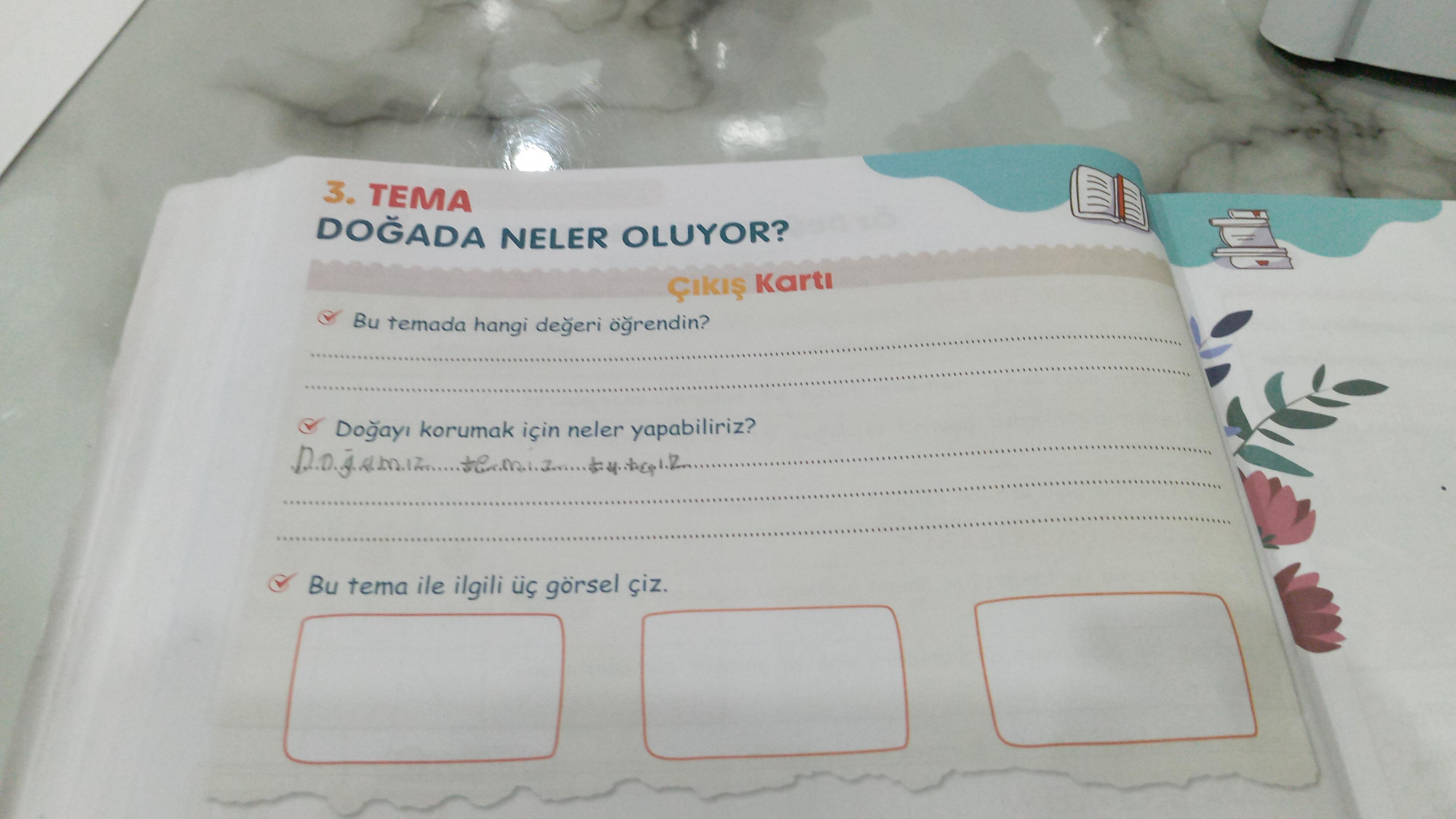 | 3 | Bu tema ile ilgili üç görsel çiziniz. | Ağaç dikme, çöp kutusu, temiz nehir |