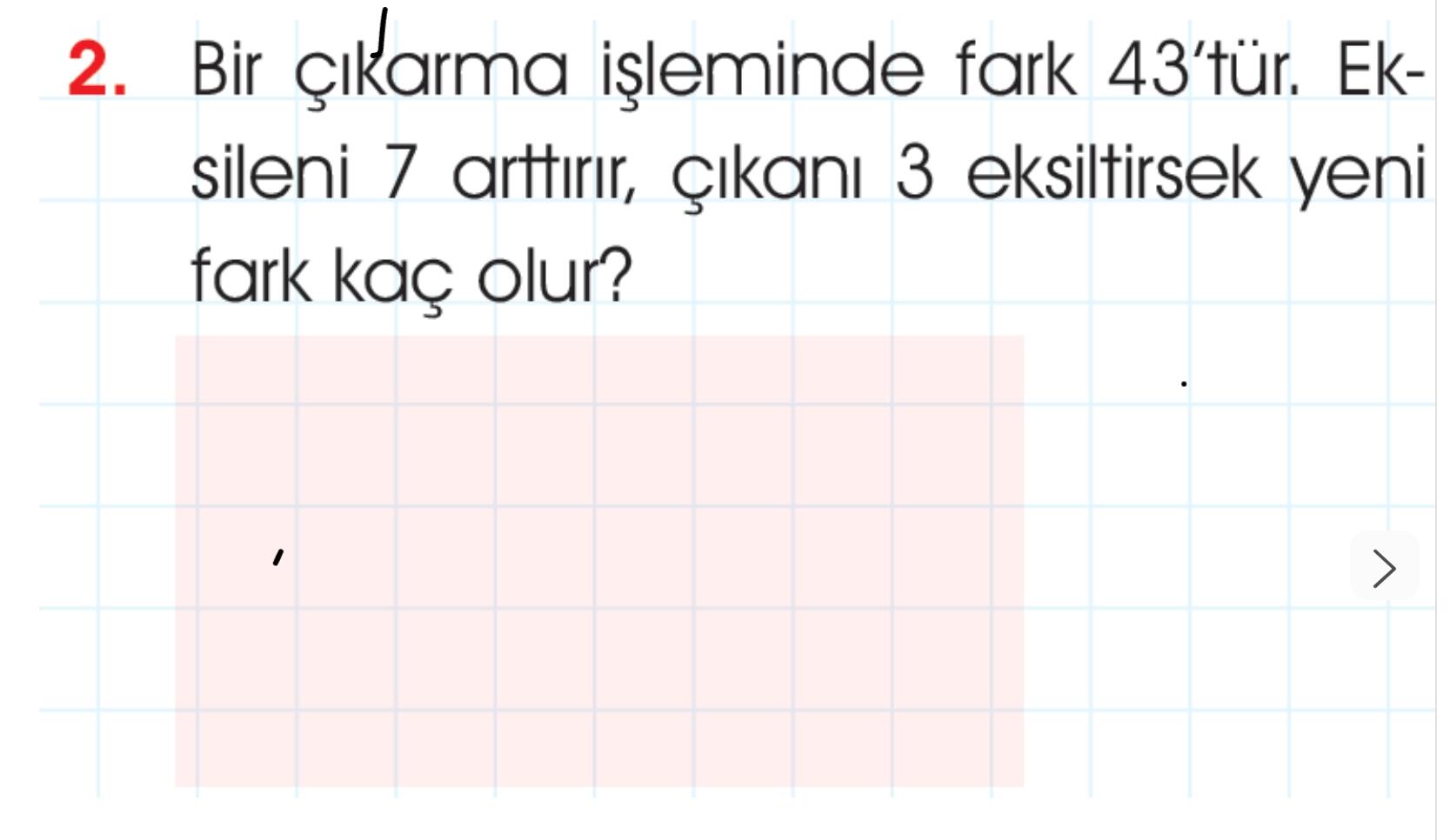 Soru: Bir çıkarma işleminde fark 43’tür. Eksileni 7 arttırır, çıkanı 3 eksiltirsek yeni fark kaç olur?