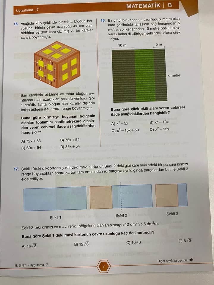 • Buna göre, başlangıçtaki (Şekil 1’deki) mavi kartonun çevre uzunluğu (desimetre cinsinden) kaçtır?