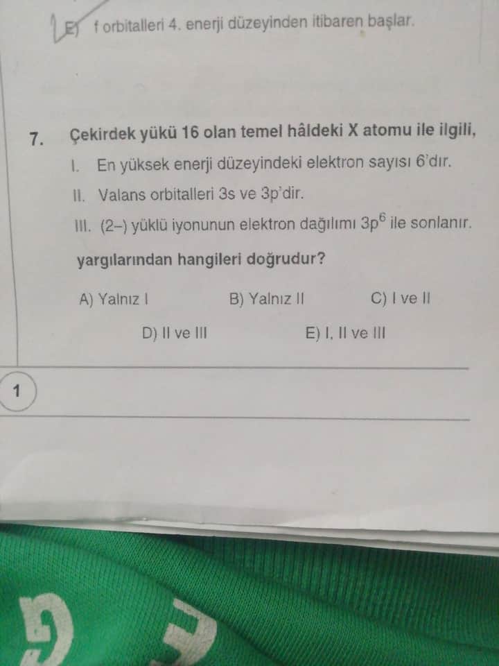 | III | (2–) yüklü iyonunun elektron dağılımı 3p⁶ ile sonlanır. | Doğru | 2– yüklü iyon, 2 elektron kazanır, toplam elektron sayısı 18 olur. 3p orbitalinde 6 elektron tamamlanır (3p⁶). |