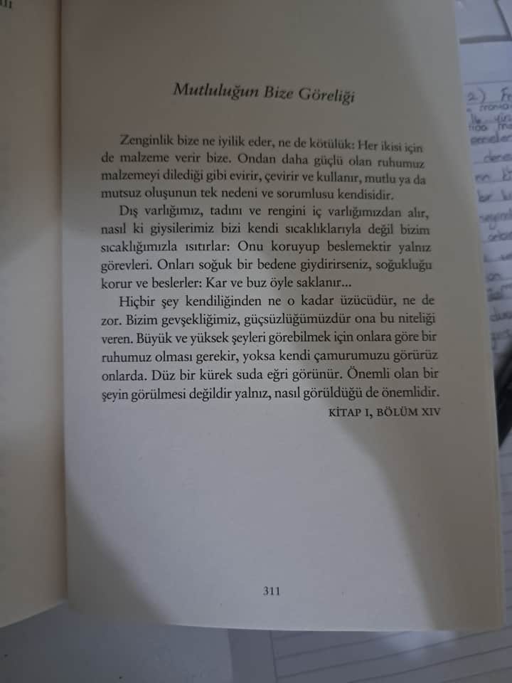 Bu metinde, mutluluğun ve mutsuzluğun dış koşullardan değil, insanın kendi ruh halinden kaynaklandığı vurgulanmaktadır. Zenginlik ya da dış etkenler ne iyi ne de kötü bir şey yapar; bunlar sadece araçtır. Asıl önemli olan, insanın iç dünyasının bu durumları nasıl algılayıp yorumladığıdır. Dış varlığımız, iç dünyamızın yansımasıdır; tıpkı giysilerin bizi sıcak tutması gibi, ruhumuz da dış dünyayı ısıtır ya da soğutur. Hiçbir şey kendi başına kötü ya da üzücü değildir; bizim zayıflığımız ve güçsüzlüğümüz onları öyle algılamamıza neden olur. Büyük ve olumlu şeyleri görebilmek için ruhumuzun da o seviyede olması gerekir. Önemli olan sadece bir şeyin görülmesi değil, onun nasıl görüldüğüdür.