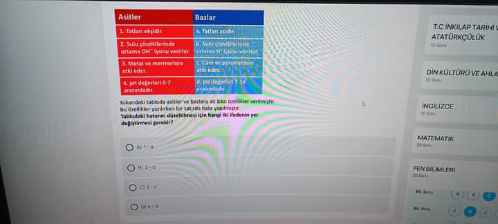Bunlar tam tersi olması gereken ifadelerdir. Yani “Asitler” sütununda H⁺ iyonu üretmek özelliği yer almalı, “Bazlar” sütununda ise OH⁻ iyonu üretmek yazmalıdır. Sonuç olarak tabloda “2 numaralı ifade” (Asitler sütununda OH⁻ üretir şeklinde belirtilen) ile “b ifadesi” (Bazlar sütununda H⁺ üretir şeklinde belirtilen) yanlış konumlandırılmıştır.