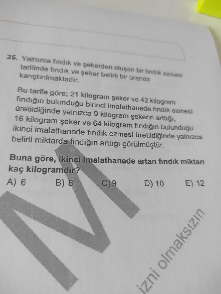 Birinci imalathanedeki veriler, fındık ezmesinin fındık/şeker oranını net bir şekilde 3.5 olarak belirlememizi sağladı. İkinci imalathanede bütün şeker kullanıldığından (16 kg), aynı orana göre 56 kg fındık kullanıldığı anlaşıldı. Toplam 64 kg fındığının 56 kg’ı üretimde kullanıldıysa, geriye 8 kg fındık kalmıştır. Dolayısıyla doğru cevap 8 kg’dır.