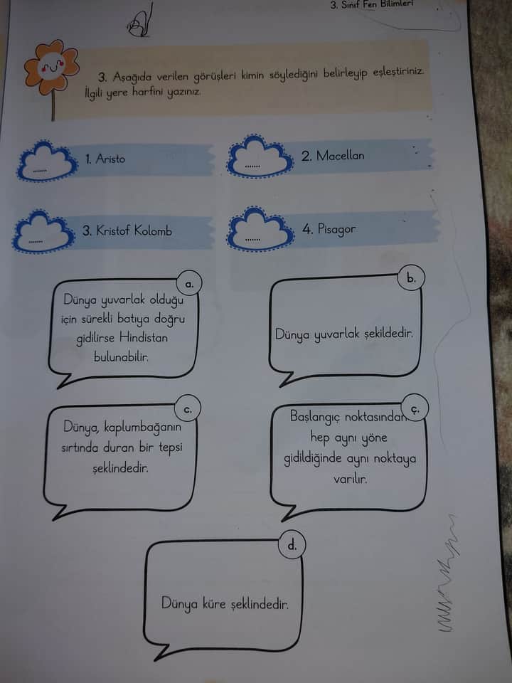 - c) “Dünya, kaplumbağanın sırtında duran bir tepsi şeklindedir.” ifadesi halk inanışına/mitlere aittir; bu dört bilim insanından hiçbiri böyle bir görüşü bilimsel olarak savunmamıştır.