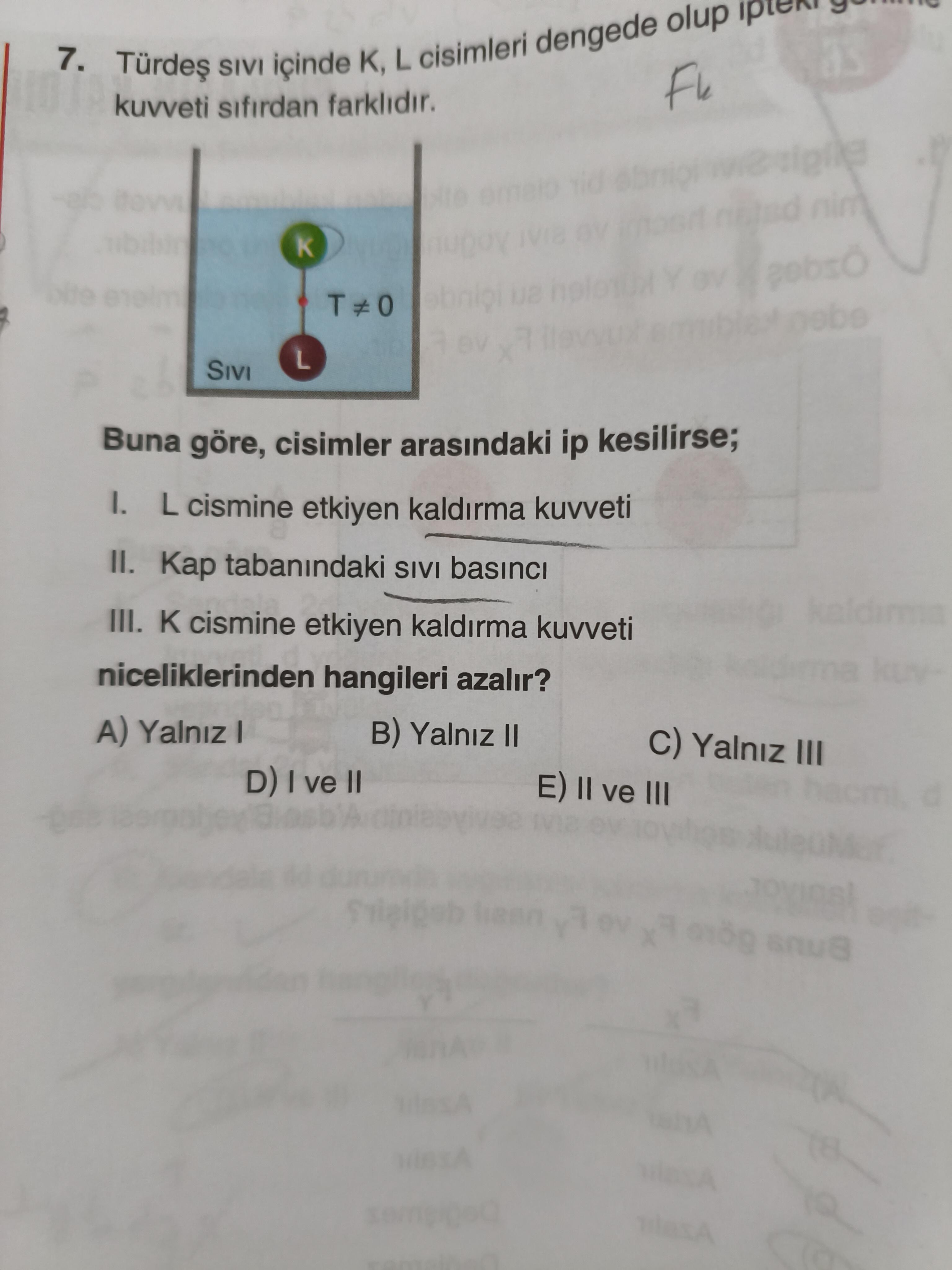 Homojen bir sıvı içinde K ve L cisimleri, birbirlerine bağlı ipler sayesinde dengededir (iplerin gerilme kuvvetleri sıfırdan farklıdır). Cisimler arasındaki ipin kesilmesi hâlinde aşağıdaki niceliklerden hangileri azalır?